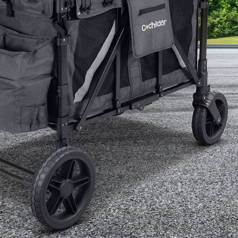 Absolutely. Our stroller wagon is engineered for smooth handling across a variety of challenging surfaces. With its robust, all-terrain wheels, it glides effortlessly over gravel, grass, mulch, uneven paths, and city sidewalks—making it the perfect companion for both urban strolls and outdoor adventures.